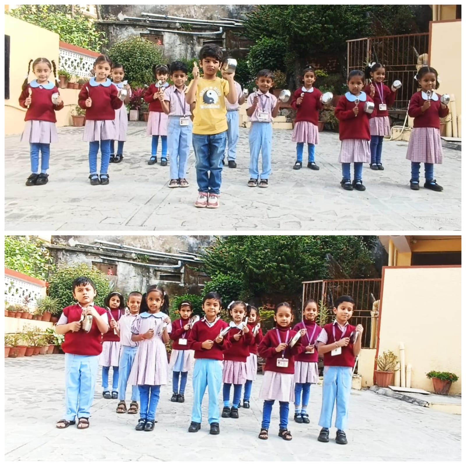 The Kindergarten students enthusiastically took part in an innovative activity titled “Making Music with Household Things.” Using everyday items like bowls, plates, glasses, and spoons, the little ones created rhythmic sounds under their teachers’ guidance, promoting creativity, coordination, and joy.