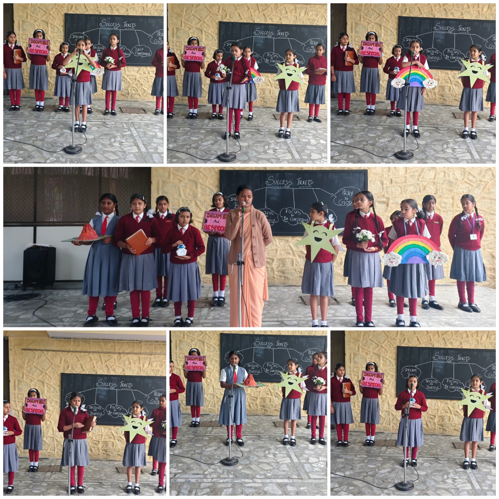 Class 5A focused on themes like Dream Big, Believe in Yourself, Consistency, Self Confidence, and The Power of Prayer. The students used creative metaphors — clock, star, flower, mountain, book, and rainbow — to show uniqueness. The Mahabharata skit, Trisha Goyar’s poem, and the action song “Yes, We Can!” added depth and motivation. The class concluded by expressing gratitude to Sister Mary , their class teacher and all primary teachers as they move to the secondary section.