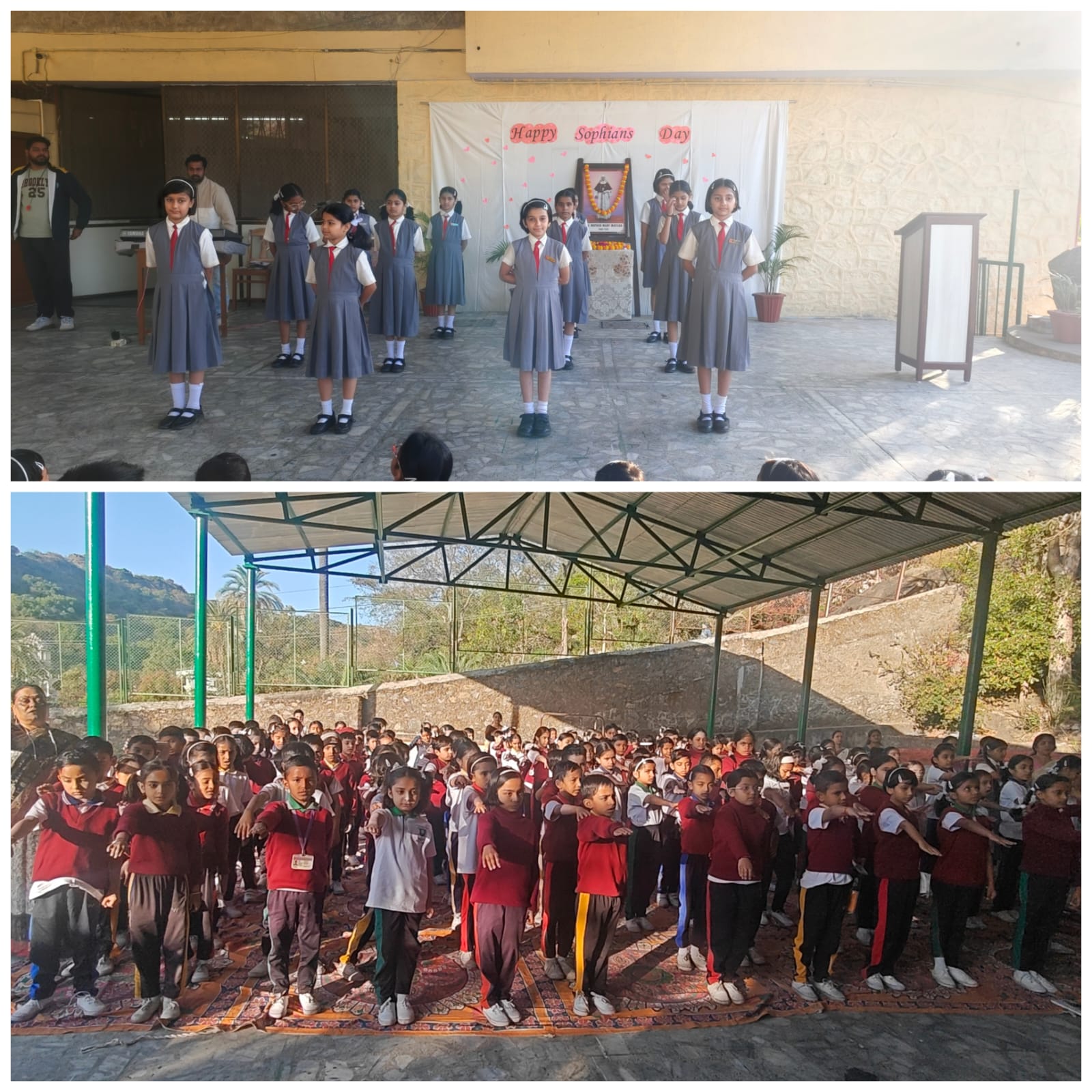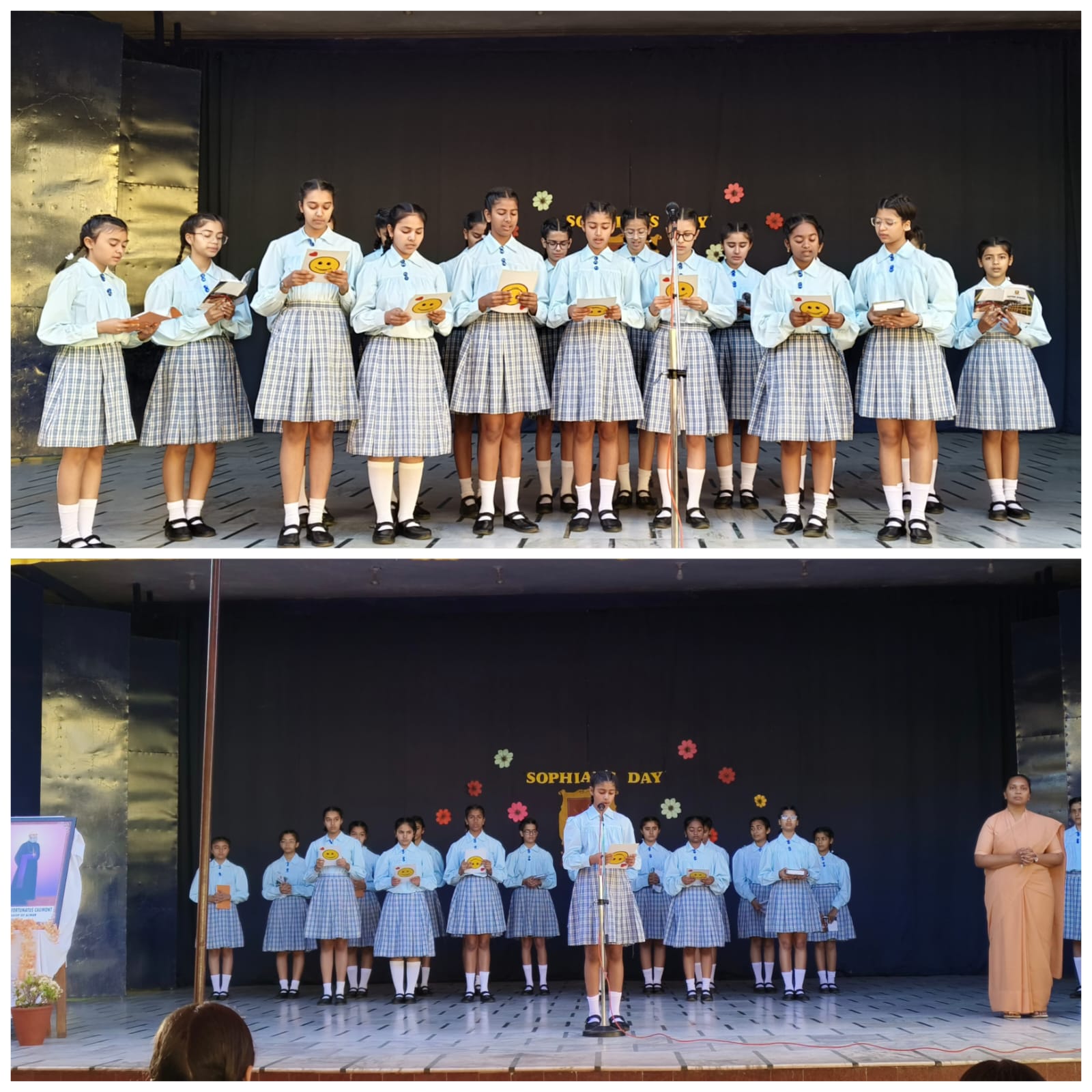 The assembly continued with the hymn “Teri Hai Zameen” and a short life sketch of Mother Mary Matilda, highlighting her dedication to the education and formation of young girls. As a tribute, Sister garlanded her portrait while teachers offered petals. The values of the institution were also highlighted through the meaning of S.O.P.H.I.A., representing wisdom, openness, excellence, humility, integrity, and service. Adding joy to the celebration, Class V students presented a graceful dance. The programme concluded with the Sophian’s Pledge and the Sophia Anthem, filling the atmosphere with pride and unity.