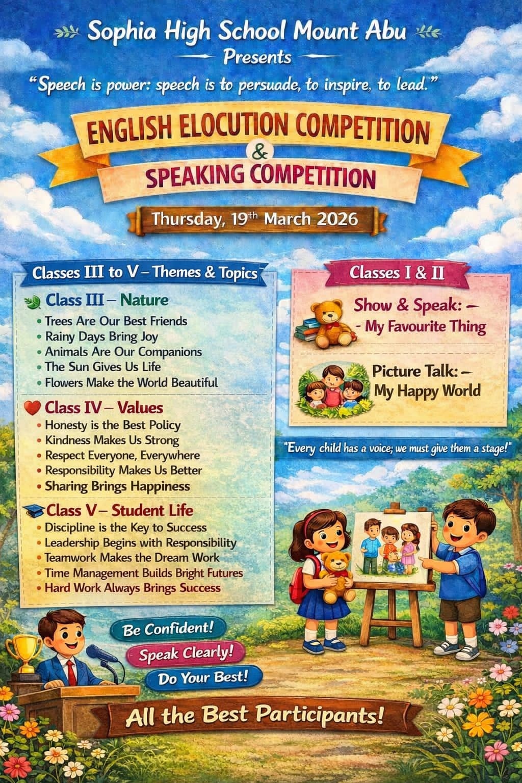 The Primary Section conducted the English Elocution and Speaking Competition on 19th March 2026 with great enthusiasm and vibrant participation.
